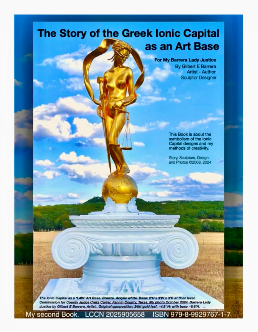 Boerne, Texas based artist, author, and sculptor, Gilbert E. Barrera, known for creating memorable Iconic sculptures. From his larger than life "Lady Justice" in front of the courthouse in San Antonio, Texas, to his medium sized "Lady Justice" located in Sherman, Texas, to the tabletop "Lady Justice"; each is exquisite, and the hand applied gold leafing is immaculate. While Barrera creates his works, he also documents and publishes books on not only the process but also the history and reasoning behind the design, pulling from the ancient Greeks. His books are for sale and available by contacting Gilbert E. Barrera.